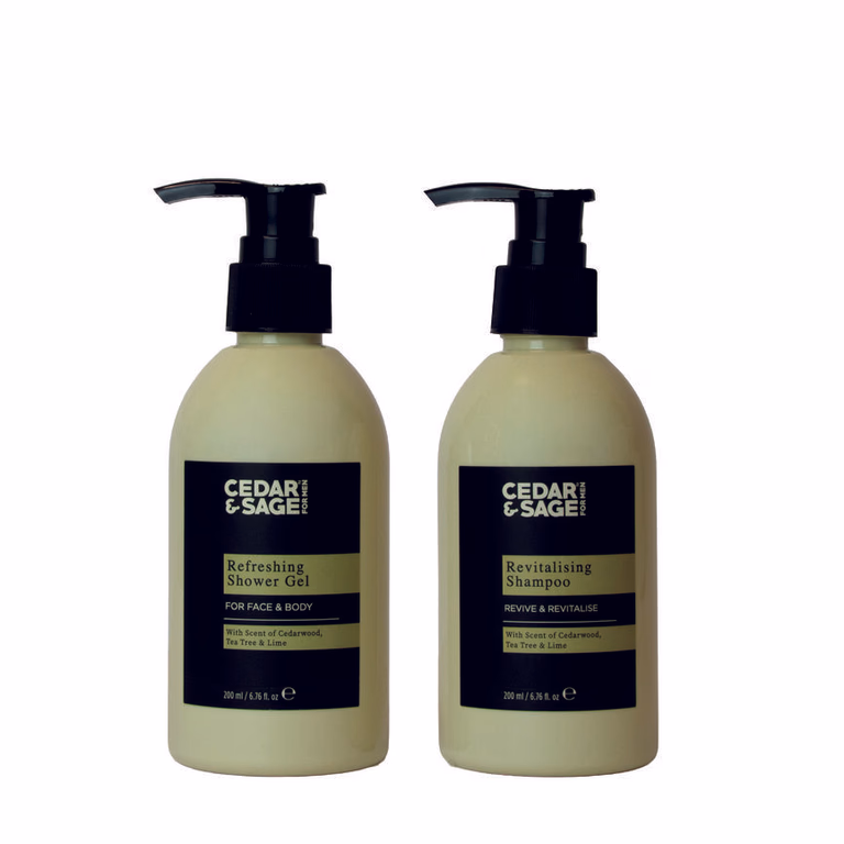 shower gel / dusjgelé: Aqua, Sodium Laureth Sulfate, Sodium Chloride, Cocamidopropyl Betaine, Decyl Glucoside, Simmondsia Chinensis (Jojoba) Seed Oil, PEG-7 Glyceryl Cocoate, Parfum, Phenoxyethanol, Benzyl Alcohol, Benzoic Acid, Citric acid, Disodium EDTA, Benzyl Salicylate. Med duft av Cedertre, tea tree & lime.