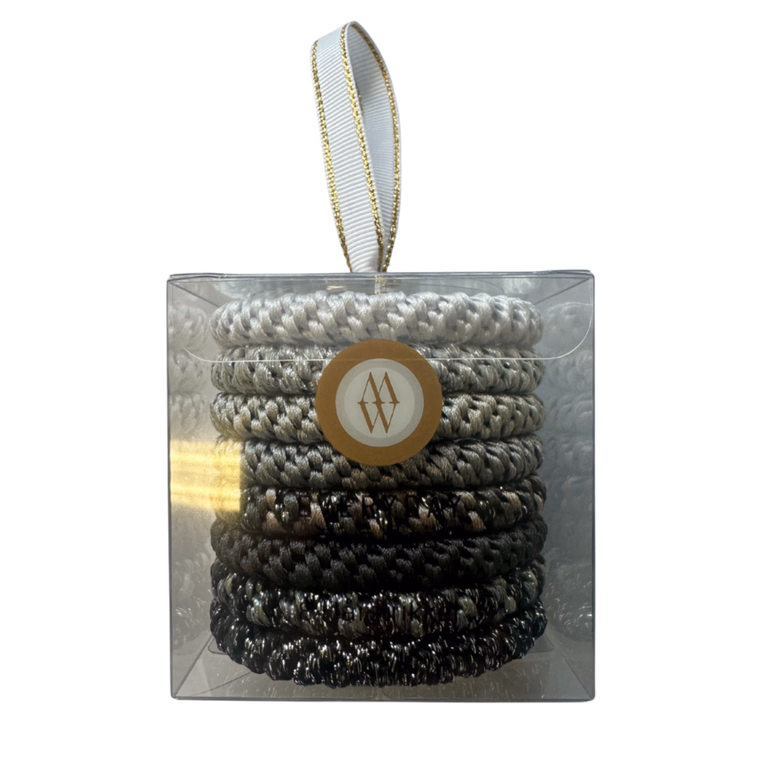 Skaff deg det ultimate basis-tilbehøret! Denne 8-pakningen med hårstrikker i klassisk sort og elegant sølv passer til ethvert antrekk. Godt hold og skånsom mot håret