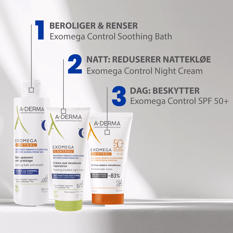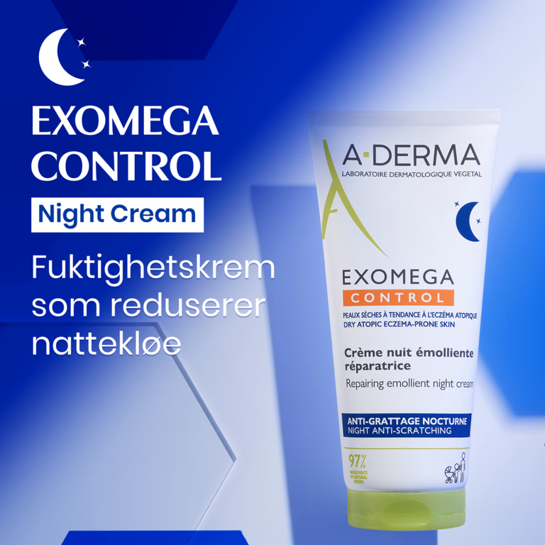 Gi din tørre og atopiske hud intensiv reparasjon over natten. A-Derma Exomega Control Night er en rik nattkrem som gjenoppbygger hudbarrieren, fukter og beroliger