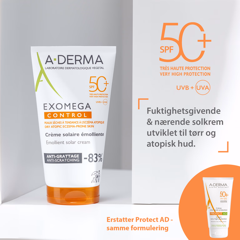 Forenkle solrutinen for hele familien! A-Derma Exomega Control SPF 50+ er en fuktighetskrem og solkrem i ett produkt. Perfekt for tørr og sensitiv hud hos både barn og voksne