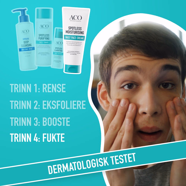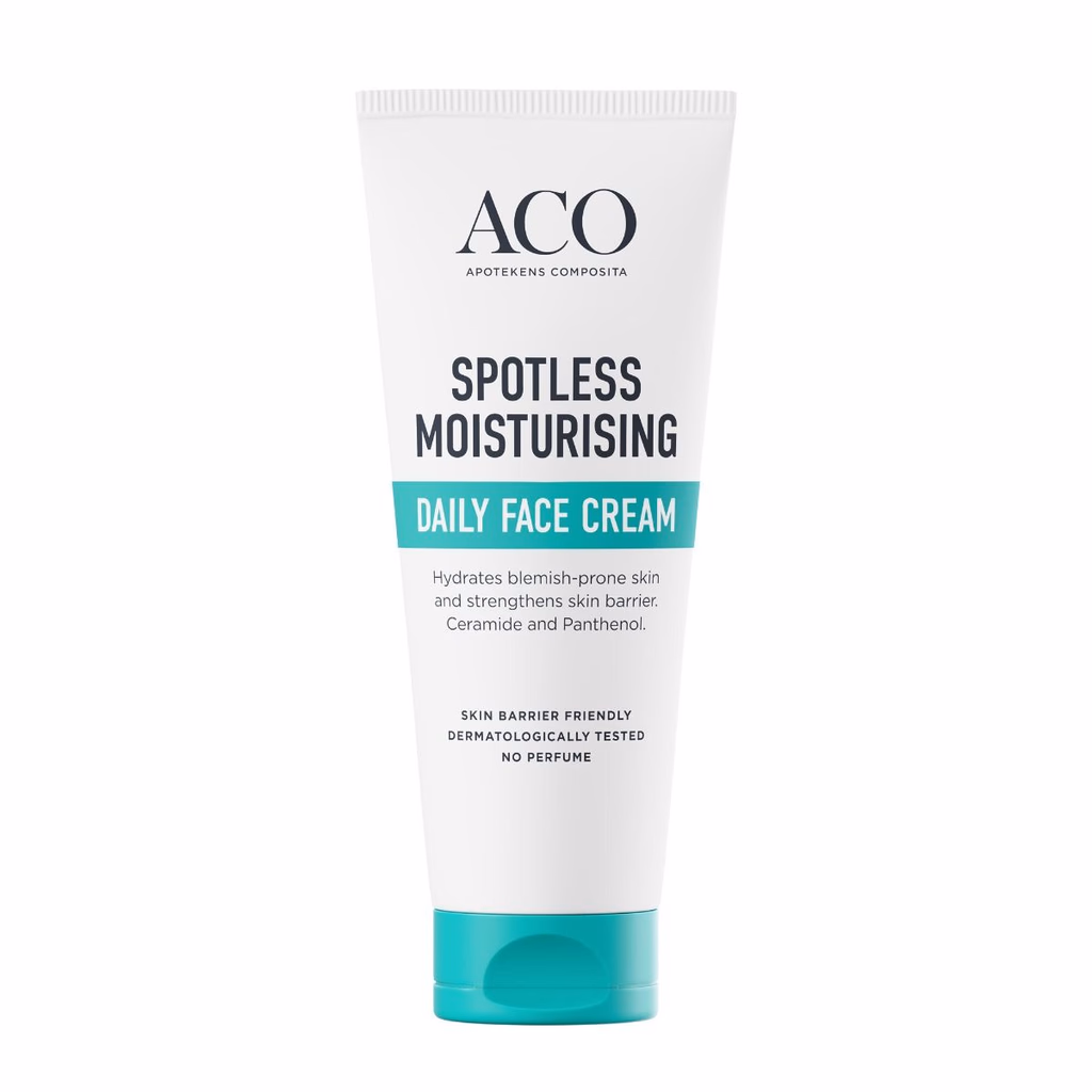 Lett ansiktskrem fra ACO Spotless for daglig bruk. Fukter uten å fete, styrker hudbarrieren og motvirker kviser. Parfymefri og klinisk testet.