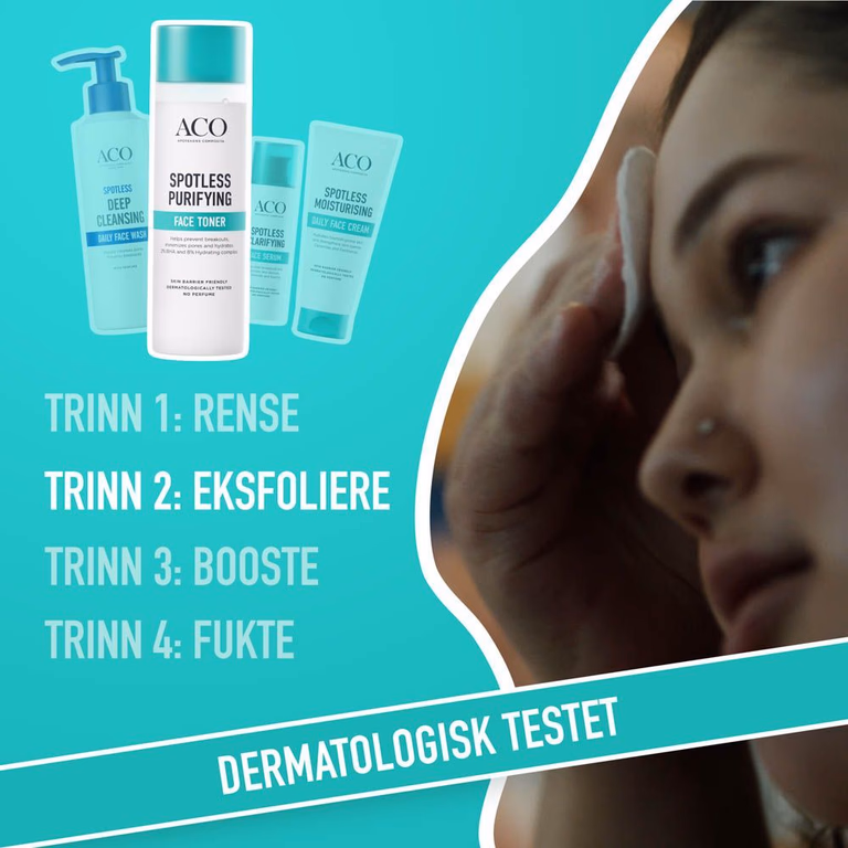 Slik bruker du toneren: Rens ansiktet først. Påfør toneren på en bomullsdott og stryk over problemområder (som T-sonen). Unngå de sarte områdene rundt øynene. Avslutt med ACO Spotless Daily Face Cream for optimal fukt.