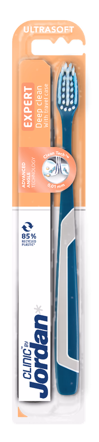 Opplev forskjellen med Jordan Clinic Expert Deep Clean. Ultrasoft bust for sensitive tenner, ergonomisk grep og inkludert reiseetui. Laget av resirkulert plast.