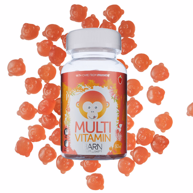 Glykose-fruktsirup, sukker, vann, maisstivelse, vitamin C (askorbinsyre), vitaminblanding (vitamin E (DL-alfakoferylacetat) vitamin B3 (nikotinamid), vitamin A (retinylacetat), vitamin D3 (kolekalciferol), vitamin B12 (cyanokobalamin), pantotensyre (kalsium-D-pantotenat), Vitamin B6 (pyridoxin HVI), vitamin K1 (fyllokinon), folsyre (pteroylmonoglutaminsyre), biotin, naturlig aroma (jordbær), surhetsregulerende middel (natriumcitrat), kokosolje, farge (svart gulrotkonsentrat), overflatebehandlingsmiddel (carnaubavoks).