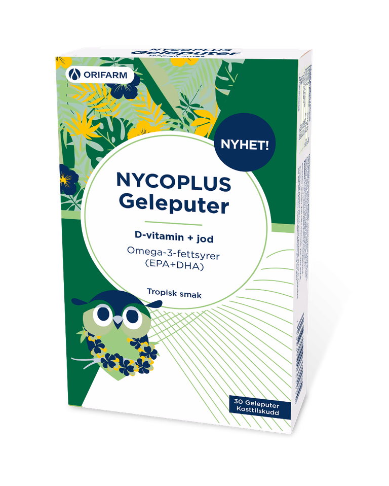 Høykvalitets Omega-3 fra Nycoplus med vitamin D3 og jod. Bidrar til normal hjertefunksjon og barns vekst. Geleputer med frisk tropisk smak.