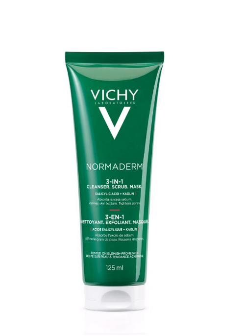 Rens porene i dybden med Vichy Normaderm 3-i-1. Aktiv rens med leire, AHA og BHA for en klarere hudtone. Perfekt for fet hud.